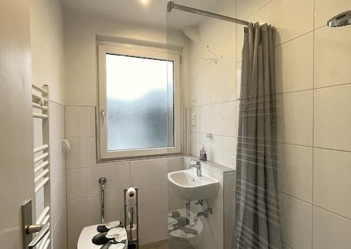 komplett sanierte Badezimmer, mit Dusche, WC und Waschtisch. Ein normal großes Fenster im Bad sorgt für