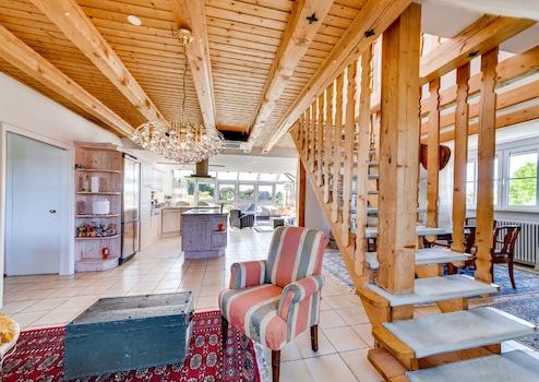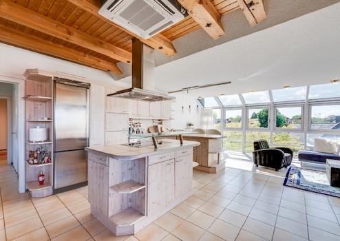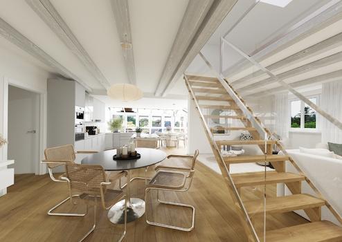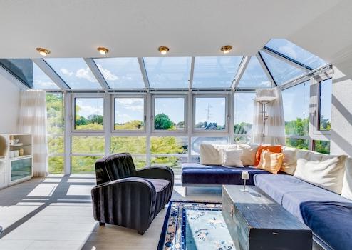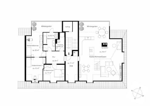 Die Maisonettewohnung erstreckt sich über das gesamte Dachgeschoss und bietet rund 163 m² Wohnfläche. Sie verfügt über drei Schlafzimmer, zwei Badezimmer, zwei Wintergärten und einen großzügigen Wohn- und Essbereich von etwa 76 m² mit integrierter Küche. Teilbereiche wurden als Galerie zum Dachspitz gestaltet und über eine Holztreppe verbunden.