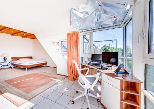 Der Dachspitz selbst ist vollständig ausgebaut und bietet vielfältige Nutzungsmöglichkeiten – im hinteren Bereich befindet sich ein abgeschlossener Raum. Ein besonderes Highlight ist die nach Westen ausgerichtete, genehmigte Arbeitsplattform, die ursprünglich für eine Amateur-Funkantenne konzipiert wurde. Von hier aus genießen Sie einen traumhaften Blick über die Villenkolonie Gern, den Nymphenburger Kanal und stimmungsvolle Sonnenuntergänge bei einem Glas Wein.