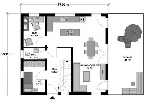 Dieses projektierte Objekt umfasst die Ausbaustufe 3 - FastFertigPlus: Diese Stufe beinhaltet eine Sanitär-Grundausstattung und lässt Ihnen die Möglichkeit, sich aktiv beim Bau einzubringen. Fachbetriebe übernehmen dabei die haustechnischen Gewerke wie Heizung, Lüftung, Sanitär und Estrich. Bei STREIF haben Sie zudem die Wahl zwischen vier Ausbaustufen insgesamt - jede bietet Flexibilität hinsichtlich Ihrer Eigenleistung und finanziellen Möglichkeiten.