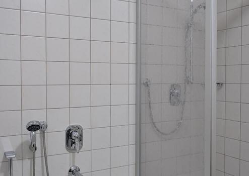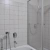 - modernes Badezimmer mit Badewanne und Dusche, inklusive Waschmaschinenanschluss