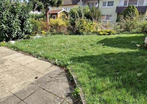 Der Garten bietet mit dem Gartenhaus, den zwei Terrassen und den Rasenflächen viel Platz für Spiel und Freizeit.