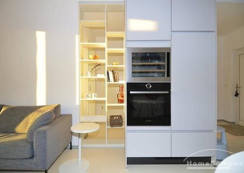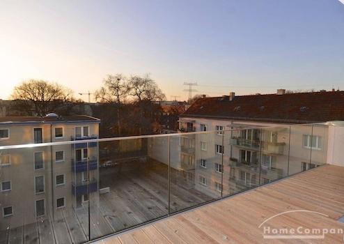 Neue Dachgeschosswohnung unmittelbar auf der Grenze Pankow/Prenzlauer Berg in ruhiger Lage. Die Wohnung verfügt über einen kombinierten Wohn-/Essraum mit eingerichteter Küche, einschließlich eines Weinkühlschranks. Im Schlafzimmer befindet sich ein Boxspringbett (140x200) und ein großräumiger Einbauschrank. Vom Wohnzimmer, ebenso wie vom Schlafzimmer erreichen Sie die rd. 17 qm große Dachterrasse mit Südwestausrichtung, die zu einen Drittel überdacht ist. Ergänzend gibt es elektrische Außenjalousien an allen Fenstern. Das Bad weist eine großzügige Dusche, einen Handtuchheizkörper und Tageslicht auf. Zusätzlich gibt es einen Abstellraum, in dem sich der Miele-Waschtrockner befindet. Die Wohnung ist vollständig eingerichtet (Bettwäsche, Handtücher, Geschirr und Gläser) und mit Designermöbeln ausgestattet (Bodema, Moormann, Gervasoni, Luceplan).
