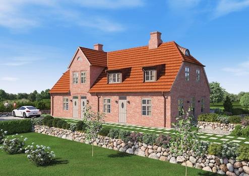 Die Fassade verblendet mit antiken Klinkersteinen, das Dach gedeckt mit Dachstein Ziegeln, die Eingangstüren nach „nordischer Art“ gestaltet: