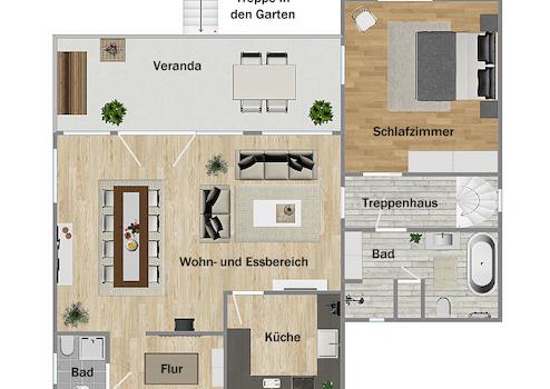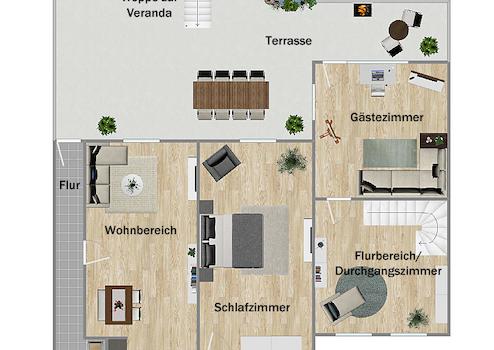 Der offene Grundriss des Hauses definiert sich über klare Raumstrukturen. Mit einer großzügigen Wohn- und Nutzfläche von ca. 177 m² bietet das Haus mehr als genug Platz für eine Familie. Die Eigentümer haben wertige Materialien verarbeitet und sich ein gemütliches Zuhause geschaffen.