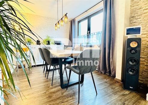 Vom hellen Wohn-/Esszimmer haben Sie Zugang zum Sonnenbalkon mit mechanischer Markise, auf dem Sie entspannte Stunden mit Fernblick über das grüne Wohnquartier genießen dürfen.