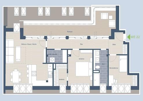 Als Penthouse gestaltet, verteilt sich diese Wohneinheit auf 3 lichtdurchflutete Räume, ein Badezimmer mit Badewanne und Doppelwaschbecken, eine Abstellkammer/Hauswirtschaftsraum sowie eine über 18 m² Terrasse, welche sich über die gesamte Länge der Wohnung erstreckt und diese mit Tageslicht durchflutet.