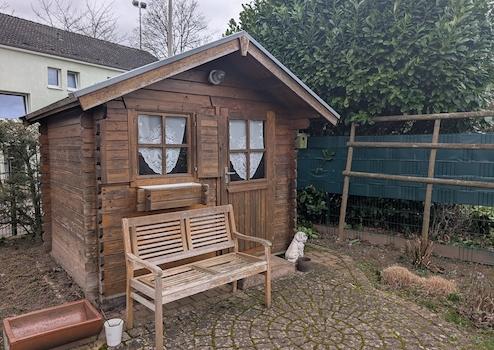 ✅ Überdachte sonnige Terrasse mit Blick in den gepflegten Garten samt Gartenhaus