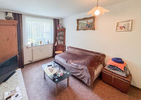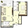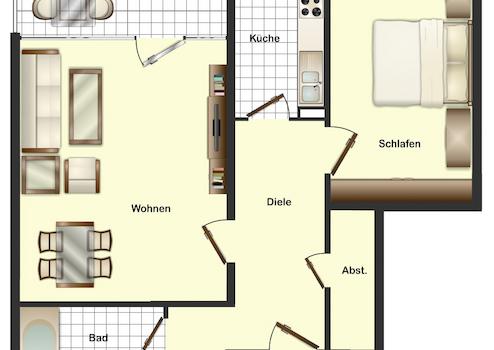 Hier verteilen sich zwei Wohn- und Schlafräume mit Küche und Wannenbad auf ca. 65 m². Der Grundriss ist durchdacht – alle Räume sind von der Diele aus erreichbar.