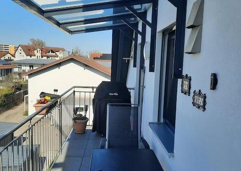 - Glasüberdachung auf einem Balkon, Markise auf dem 2. Balkon