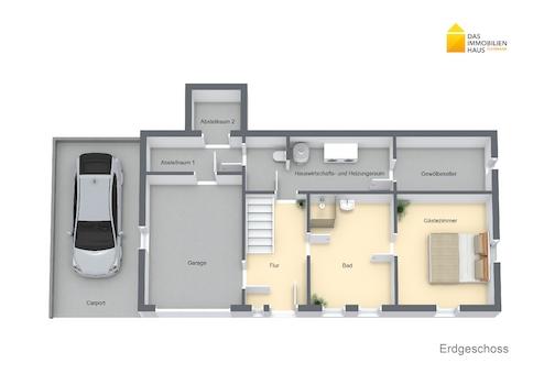 Erdgeschoss: Flur/ Treppenhaus, Bad, Gästezimmer, Hauswirtschaftsraum, Gewölbekeller, 2 Abstellräume, Garage