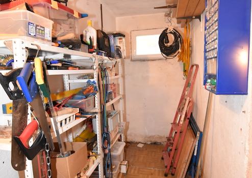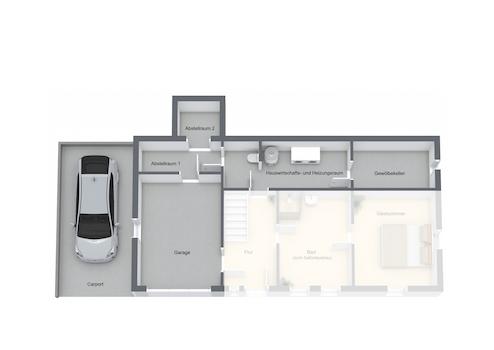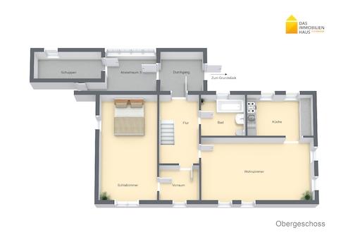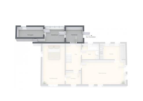 Abstellraum, Zugang zum Schuppen, Vorraum, Wohnzimmer, Küche, Bad, Schlafzimmer