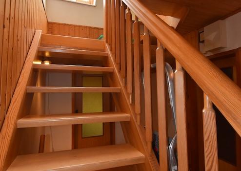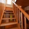Zugang zum OG = eingestemmt Holztreppe (1995) mit wandhängender Rundholzhandlauf