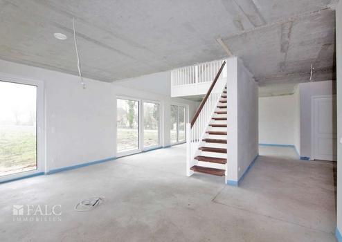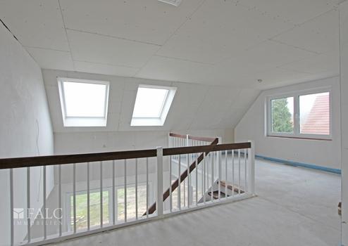Auf rund 161 m² Wohnfläche verteilen sich zwei Ebenen mit großzügigem Wohn- und Essbereich samt offener Küche, bodentiefen Fenstern für lichtdurchflutete Räume und direktem Gartenzugang. Die offene Galerie im Obergeschoss schafft luftige Verbindungen und ist ideal als Leseecke, Homeoffice oder Spielbereich. Erdgeschoss und Obergeschoss bieten eine durchdachte Raumaufteilung: Gästezimmer, Duschbad, Technikraum mit Hauswirtschaftsfunktion, Schlafzimmer mit Ankleide, Kinderzimmer und ein stilvolles Wannenbad.