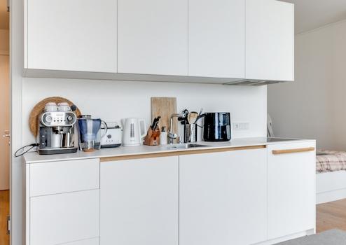 Moderne, offene Einbauküche mit sämtlichen Elektrogeräten