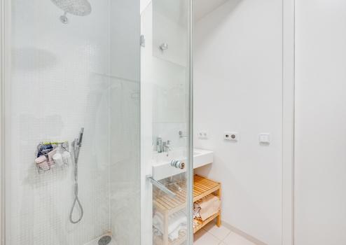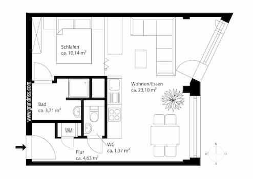 Die offene Einbauküche vom Schreiner im großzügigen Wohnbereich ist mit hochwertigen Markengeräten ausgestattet und lässt keine Wünsche offen. Das elegante Bad überzeugt mit einer großzügigen, ebenerdigen Dusche, WC und Waschbecken. Ein zusätzliches Gäste-WC im Flur rundet die sanitären Einrichtungen der Wohnung ab.