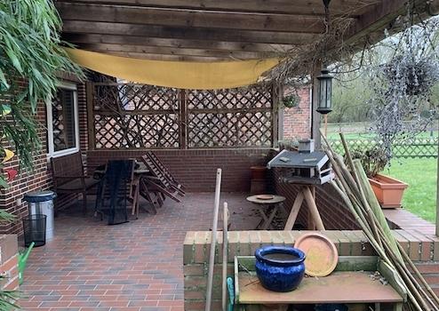 Direkt an den Wohn- und Essbereich angrenzend befindet sich eine großzügige, windgeschützte Terrasse. Umrahmt von Mauern und überdacht mit einer lichtdurchlässigen Eindeckung genießen Sie hier entspannte Stunden mit Blick ins Grüne – ideal für gesellige Abende mit Familie und Freunden.