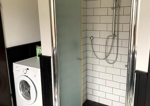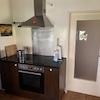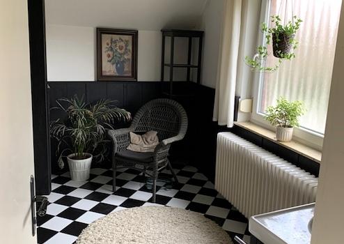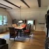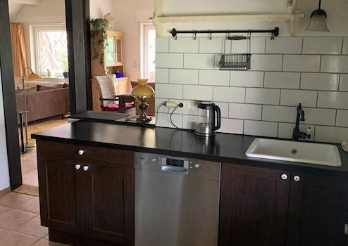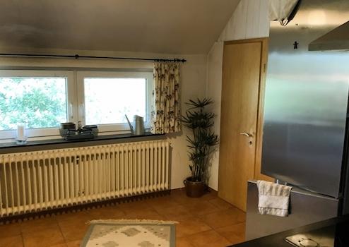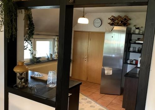 Die angrenzende offene Küche überzeugt mit einer praktischen Durchreiche aus originalem Fachwerk, die dem Raum rustikale Authentizität verleiht und gleichzeitig moderne Funktionalität bietet. Direkt neben der Küche befinden sich der Hauswirtschaftsraum sowie der Zugang zum praktischen Kellerraum.