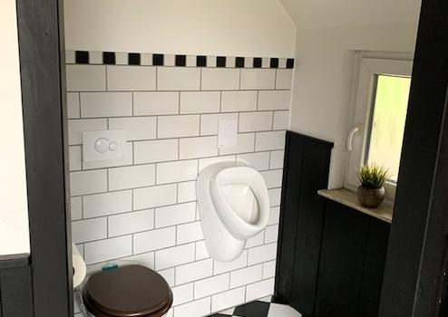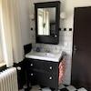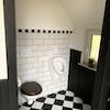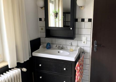 Das stilvolle Badezimmer überzeugt mit einer eleganten Schwarz-Weiß-Gestaltung und sorgt für zeitlose Ästhetik.