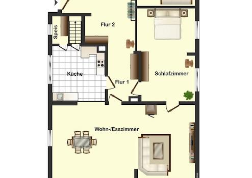 Das großzügige Schlafzimmer lädt mit seiner ruhigen Atmosphäre zum Entspannen ein und bietet viel Privatsphäre. Das angrenzende Kinderzimmer lässt sich flexibel nutzen – sei es als Kinder-, Gäste- oder komfortables Arbeitszimmer. Mit geringem handwerklichem Aufwand (z. B. durch das Einziehen einer Leichtbauwand) kann das große Schlafzimmer bei Bedarf auch wieder in zwei separate Räume unterteilt werden.