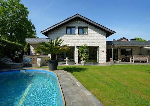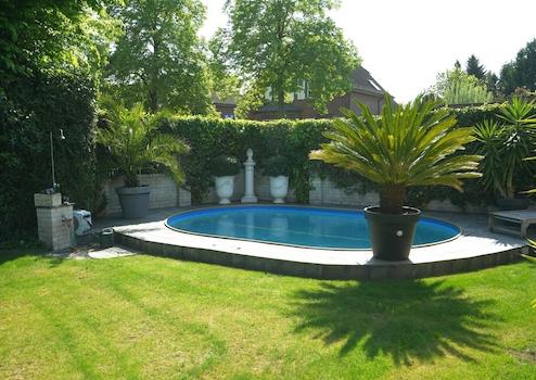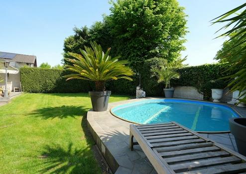 Das pflegeleicht angelegte Grundstück in sonniger Südlage ist ein echtes Highlight: Der große uneinsehbare Garten mit gepflegter Grünfläche, der Außenpool, ein eigener Brunnen mit Gartenpumpe sowie die große Terrasse laden zu entspannten Stunden im Freien ein – hier lassen sich Sommerabende wie im Urlaub genießen. Ein Gäste-WC, ein Garderoben- sowie ein Hauswirtschaftsraum rundet das Raumangebot im Erdgeschoss ab.