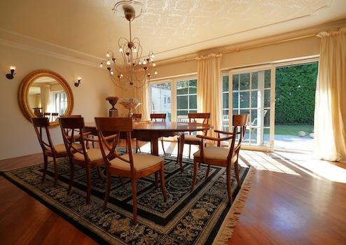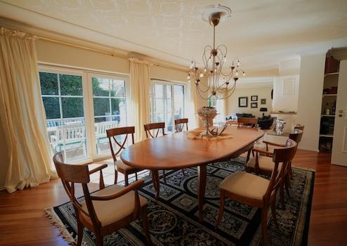 Beim Betreten des Hauses eröffnet sich Ihnen ein großzügiger und lichtdurchfluteter Eingangsbereich mit hochwertigen Bodenfliesen – ein stilvolles Entrée, das sofort ein Gefühl von Zuhause vermittelt. Von hier aus gelangen Sie in die geräumige Küche mit Einbauküche, ins helle Wohnzimmer mit Kaminofen sowie in das offen gestaltete Esszimmer mit direktem Zugang zur überdachten Terrasse mit Markise. Das Wohn- und Esszimmer ist mit edlem Kirschbaum-Parkett ausgestattet und bietet durch die großen Fensterflächen viel Tageslicht sowie einen harmonischen Übergang in den Garten.