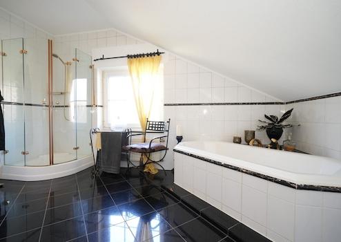 Das teilweise aufgestockte Dachgeschoss beherbergt ein großzügiges Master-Schlafzimmer mit angrenzendem Ankleidezimmer sowie ein hochwertiges Tageslichtbad mit Eckwanne und Eckdusche – Ihr ganz persönlicher edler Rückzugsort.