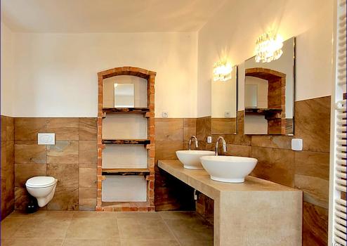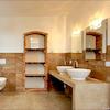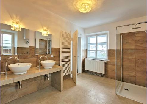 • Bad mit bodenebener Dusche, zwei Waschbecken, Toilette und Handtuchheizkörper