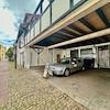 Dieser Verbindungsbau zwischen den beiden Fachwerkhäusern dient als Dachterrasse der daran anliegenden Wohnungen im 1. Stock, sowie auch als Überdachung der Stellplätze.
