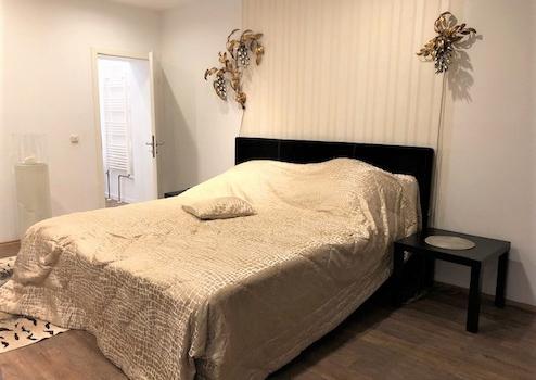 Das Schlafzimmer mit Doppelbett bildet den Rückzugsbereich. Ein an das Schlafzimmer angrenzendes Wannenbad vervollständigt diese außergewöhnliche Wohnung.