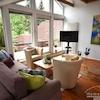 Das Wohnzimmer ist mit einer komfortablen Wohnlandschaft ausgestattet. Ein stilvoller Kamin trägt nicht nur zur Behaglichkeit bei, sondern sorgt auch an kühleren Abenden für eine wohltuende Wärme. Vom Wohnzimmer aus hat man direkten Zugang zu einem Balkon.