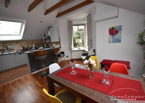 Diese charmante Einliegerwohnung, die über einen eigenen, separaten Zugang verfügt, befindet sich im ersten Obergeschoss eines gemütlichen Einfamilienhauses. Die durchdachte Gestaltung der Räume ermöglicht es, dass alle Zimmer bequem und direkt vom Flur aus zugänglich sind. Im Herzen der Wohnung versteht sich das offen gestaltete Wohnzimmer als ein einladender Treffpunkt, der sowohl den Essbereich als auch die angrenzende moderne Küche umfasst.