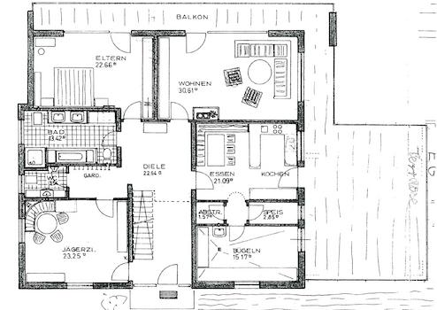 EG: Diele, Wohnzimmer mit Ausgang zum Balkon und großer Terrasse, Wohnküche, Abstellraum, Speis, Hauswirtschaftsraum, Schlafzimmer, Bad, Gäste-WC, Kinderzimmer (steht leer)