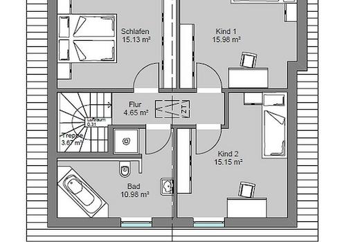 Darf es etwas mehr sein? Den beliebten Hausentwurf mit Satteldach gibt es jetzt auch mit 128 m² Wohnfläche. Das bedeutet: Jeder Raum ist großzügiger. Unten das Familien-Kommunikationszentrum mit offener Küche und angrenzendem Hauswirtschaftsraum. Oben Schlafzimmer, Bad und zwei Kinderzimmer. Die Flure nehmen den Räumen auch bei diesem Entwurf keinen Platz weg.