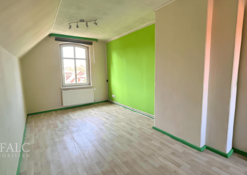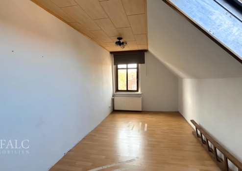Im Obergeschoss befinden sich ein großes Schlafzimmer sowie ein weiteres Zimmer, das sich flexibel als Kinder-, Arbeits- oder Gästezimmer nutzen lässt. Besonders hervorzuheben ist das helle, großzügig geschnittene Badezimmer mit Tageslicht, Dusche und Badewanne. Eine Treppe führt weiter ins Dachgeschoss, wo zwei weitere Zimmer sowie eine praktische Abstellkammer zusätzlichen Raum bieten.