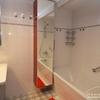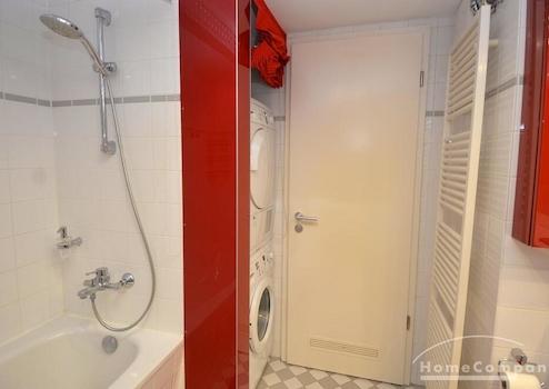 Das moderne Badezimmer verfügt über eine Badewanne mit Duschfunktion und eine Waschmaschine und Trockner.