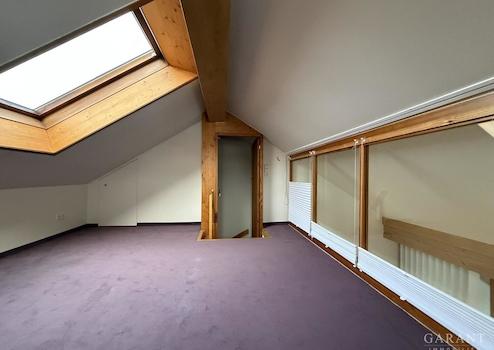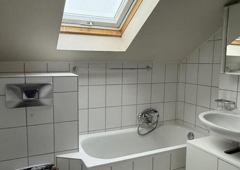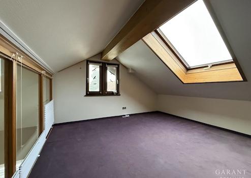 Ein stilvolles Schlafzimmer, ebenso mit Balkonzugang, sowie ein Tageslicht-Bad mit WC, Waschbecken, Dusche und Badewanne finden sich nebenan. Über eine stilvolle Innentreppe gelangen Sie ins Dachgeschoss. Dieses geräumige Zimmer kann vielseitig genutzt werden - sei es als privater Rückzugsbereich, Büro oder Gästezimmer. Auch hier haben Sie eine tolle Sicht in die Natur.