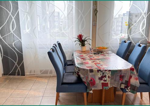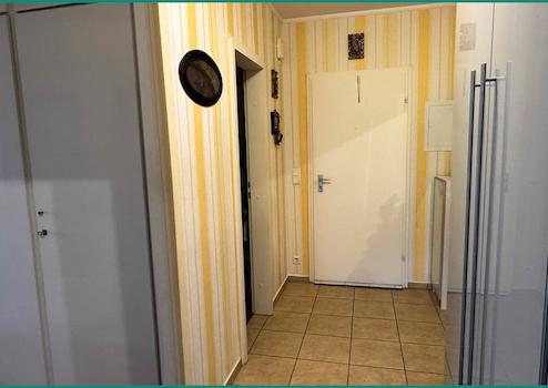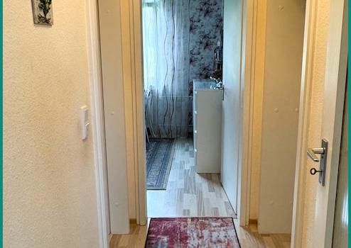 Die Wohnung verfügt über ein helle, gepflegte und zeitgemäße Ausstattung. Die Böden in der Diele und im Flur sind mit einer hellen Fliese ausgelegt und daher sehr pflegeleicht. Im Flur ist ein großer und praktischer Einbau- und Garderobenschrank untergebracht. Im Gäste-WC mit dunkelgrauer Boden- und weißer ¾ hoher Wandverfliesung ist statt eines WCs eine Waschmaschine aufgestellt und an das Handwaschbecken angeschlossen, da es im Hauskeller keinen Waschraum gibt. Der gemütliche Wohnbereich ist mit einem Laminat im Nussbaumdekor ausgelegt. Von hier ist der gut nutzbare Balkon mit westlicher Ausrichtung und schönem Blick in den Hausgarten zugänglich. Die Küche dient auch als Durchgangsraum und bietet herrlich viel Platz auch für einen großen Esstisch. Die Kücheneinbauten gehören dem Mieter. Über einen kleinen Flur, ausgelegt mit einem hellen Laminat, gelangt man zum Badezimmer mit Badewanne und weiß verfliesten Wänden. Der Boden ist mit einer grauen Fliese ausgelegt. Passend dazu gibt es weiße Sanitärobjekte, wie ein WC, ein Handwaschbecken und eine Badewanne. Ein gemütliches Kinder- oder Gästezimmer mit hellem Laminatboden und daneben ein großes Schlafzimmer schließen sich an.