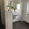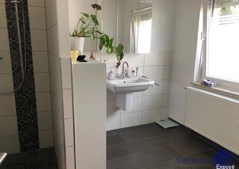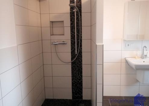- Badezimmer mit Begehbare Dusche, Toilette und Waschtisch (mit Fußbodenheizung)