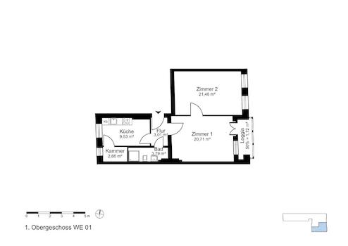 Im Erdgeschoss ergänzt eine charmante Gewerbeeinheit das Angebot, mit einer Fläche von rund 56 m². Besonders hervorzuheben ist der unausgebaute Dachboden, der Potenzial für zwei weitere Wohneinheiten mit Flächen von ca. 45 m² und ca. 131 m² bietet.