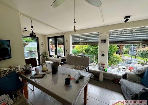 Das Wohnzimmer wurde im Stil eines Wintergartens konzipiert und besticht durch seinen lichtdurchfluteten Raum und den Blick in den Garten.
