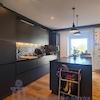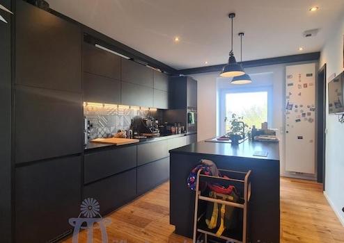 Ein weiteres Highlight dieses außergewöhnlichen Objektes ist die hochwertige moderne Einbauküche mit anthrazitfarbenen Fronten und schwarzer Granit-Arbeitsplatte; die geräumige ca. 15 m² große Küche mit anschließender Speisekammer ist offen zum Wohn-Esszimmer; auf der anderen Seite gelangt man von der Küche auf die ca. 40 m² große Freiterrasse und zum Garten.