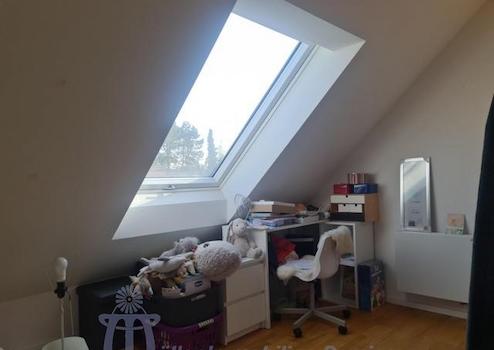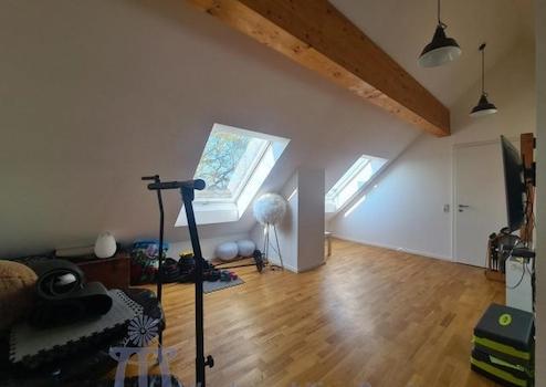 Im Studioraum und im Kinderzimmer des Dachgeschosses sind die Decken nach oben offen bis zum Dachverlauf.