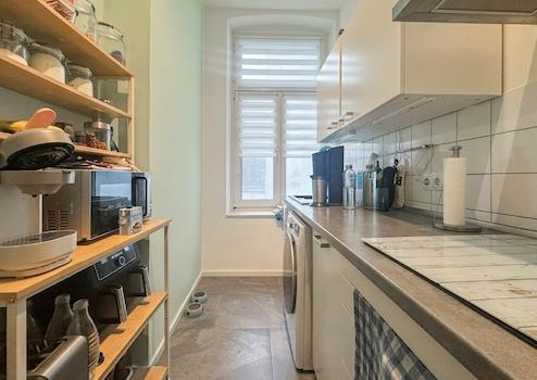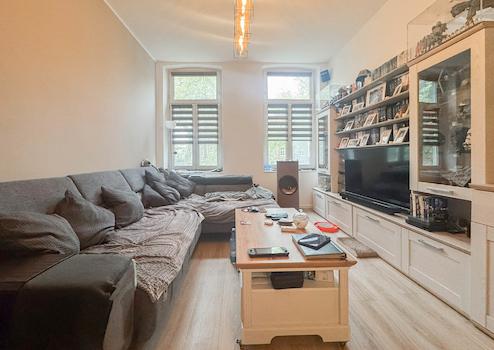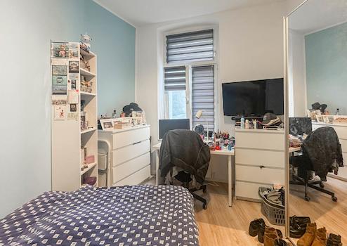 Die Drei-Zimmer-Wohnung mit den attraktiven hohen Decken liegt im 1. Obergeschoss in einem gepflegten Sieben-Parteien-Haus.
