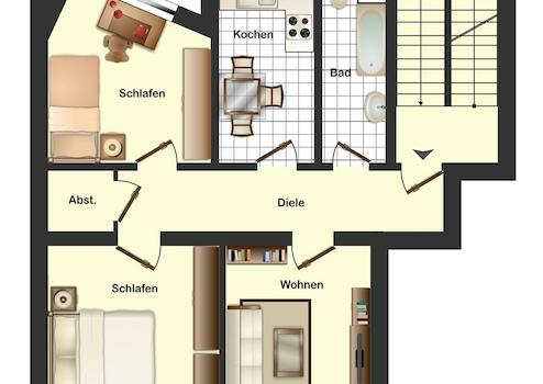Auf ca. 68 m² verteilen sich ein gemütlicher Wohnbereich, zwei Schlafräume, Küche sowie ein Wannenbad.
