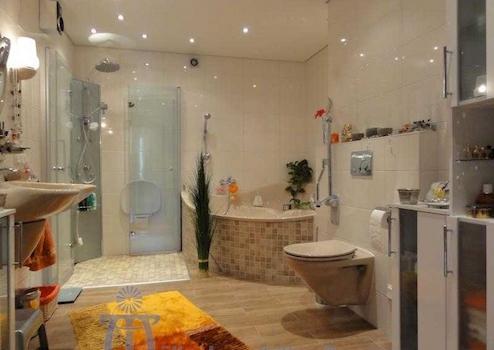 - weiße Holzdecke mit Einbauleuchten im exklusiven Bad des EG