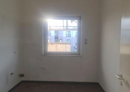 Flur, offene Küche mit moderner Einbauküche (mit weißen Fronten), Esszimmer, überdachter Süd-West-Balkon, großes Wohnzimmer, Schlafzimmer, Bad (Dusche, Waschbecken, WC)