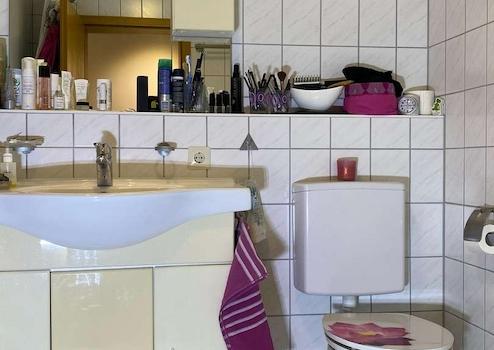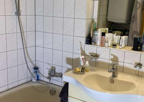 - Badezimmer: Badewanne mit Duschfunktion, Waschbecken und Toilette sowie Anschluss Waschmaschine
