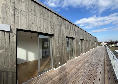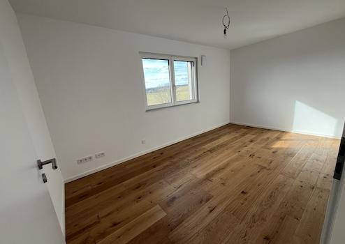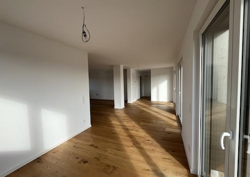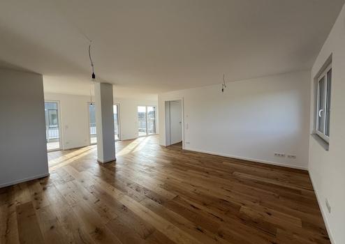 Beim Betreten der Wohnung empfängt Sie ein großzügiger Wohnraum, der durch große Fensterfronten mit viel Tageslicht durchflutet wird. Auf Wunsch kann der offen gestaltete Wohn- Essraum gegen Aufpreis mit einer Küche ausgestattet werden. Der hochwertige Holzboden verleiht dem Raum eine warme Atmosphäre. Die offene Gestaltung des Wohnbereichs ermöglicht eine flexible Einrichtung und bietet direkten Zugang zur weitläufigen Terrasse. Diese lädt zum Entspannen im Freien ein und bietet einen herrlichen Ausblick.