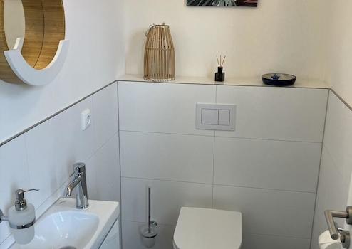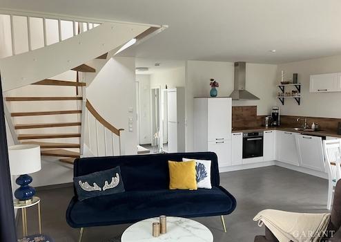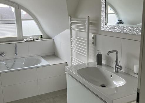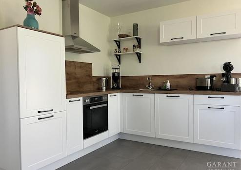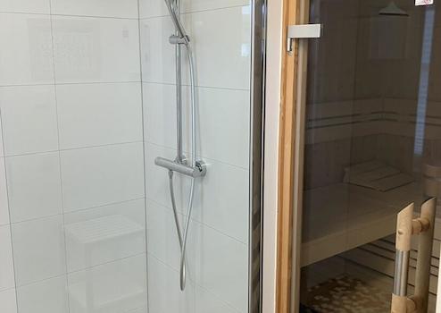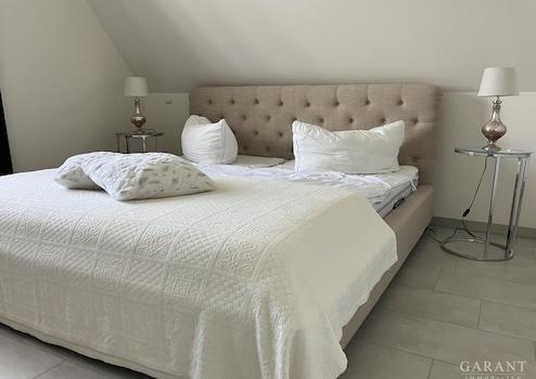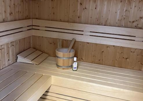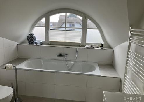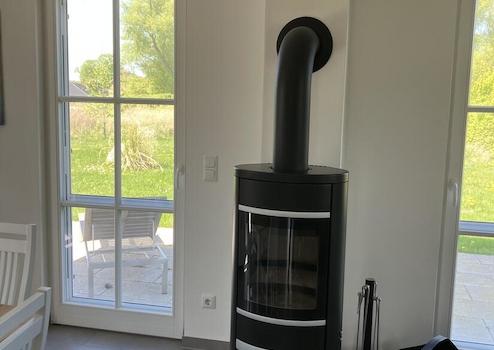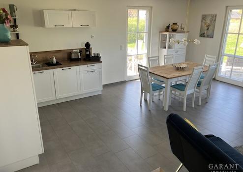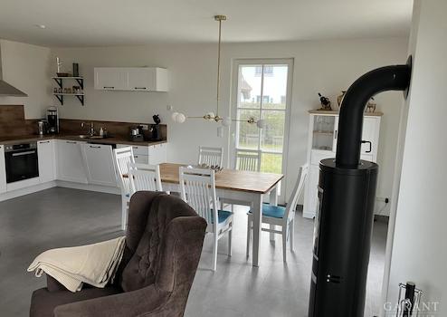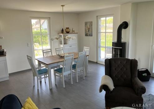 Das ruhige Haus bietet Ihnen neben zwei großen Schlafzimmern noch ein schönes Bad mit Fischaugen-Gaube im Obergeschoss. Im Erdgeschoss befindet sich ein geräumiger Wohn- und Essbereich mit einem schicken Kaminofen für gemütliche Stunden. Die Küche ist offen gestaltet. Eine große Sauna für 4 Personen mit Dusche gibt dem Haus einen Hauch von Luxus. Hauswirtschaftsraum und ein Gäste-WC runden diese Etage ab. Über die Terrassentüren kommen Sie direkt in den großzügigen Garten. Durch die Randlage haben Sie hier genügend Privatsphäre.